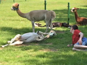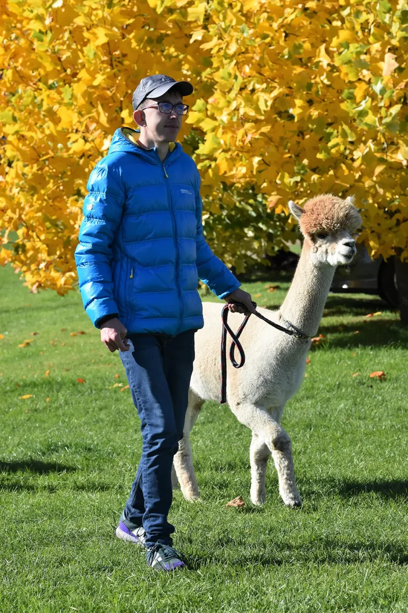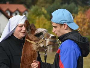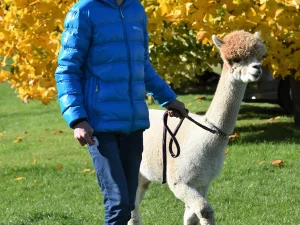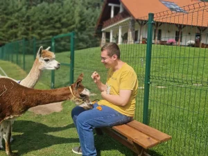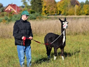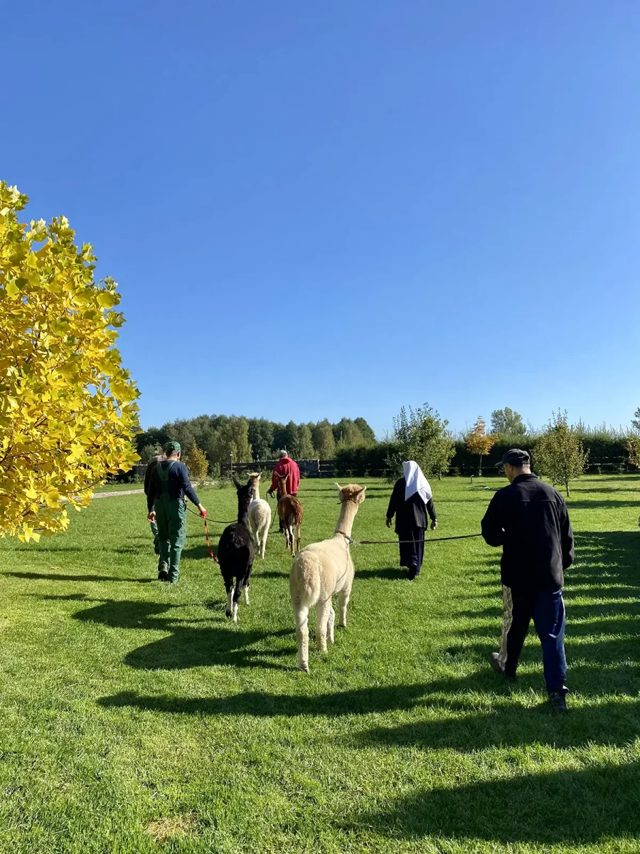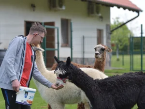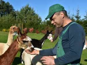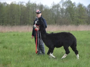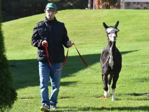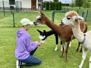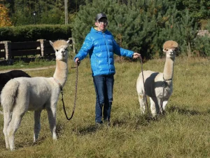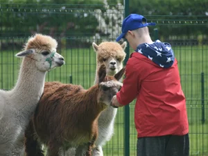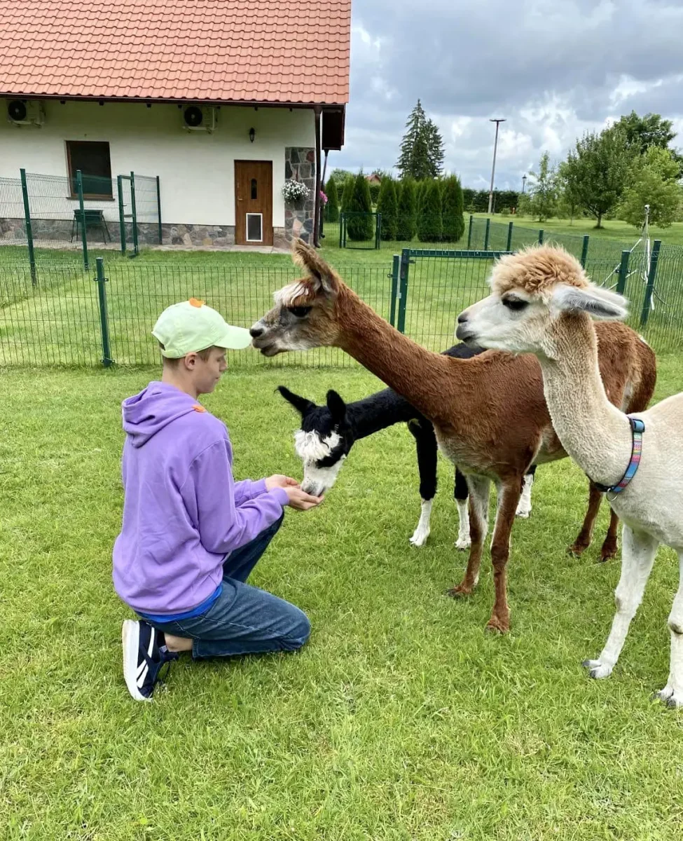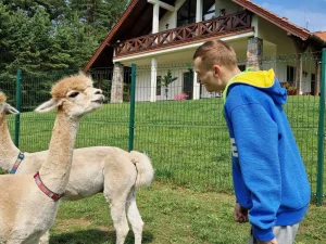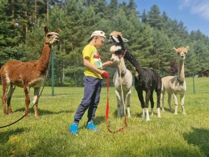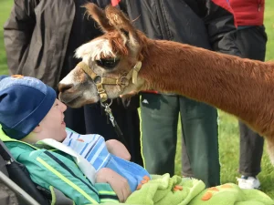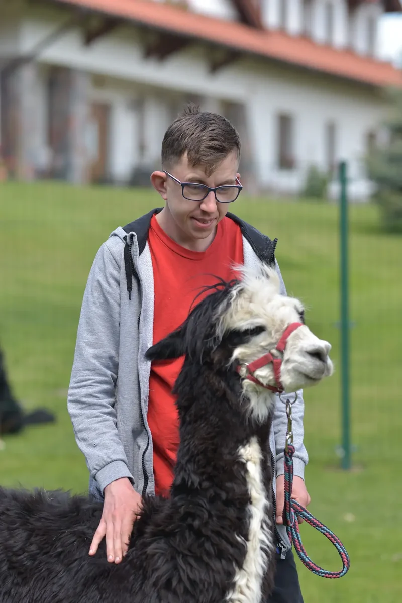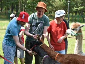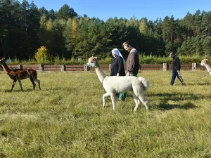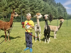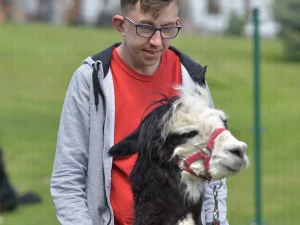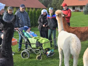 Spacery z alpakami motywują do aktywności fizycznej, rozwijają koordynację wzrokowo-ruchową, spostrzegawczość i dają poczucie sukcesu.