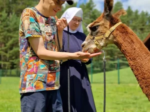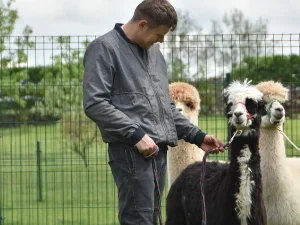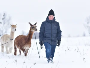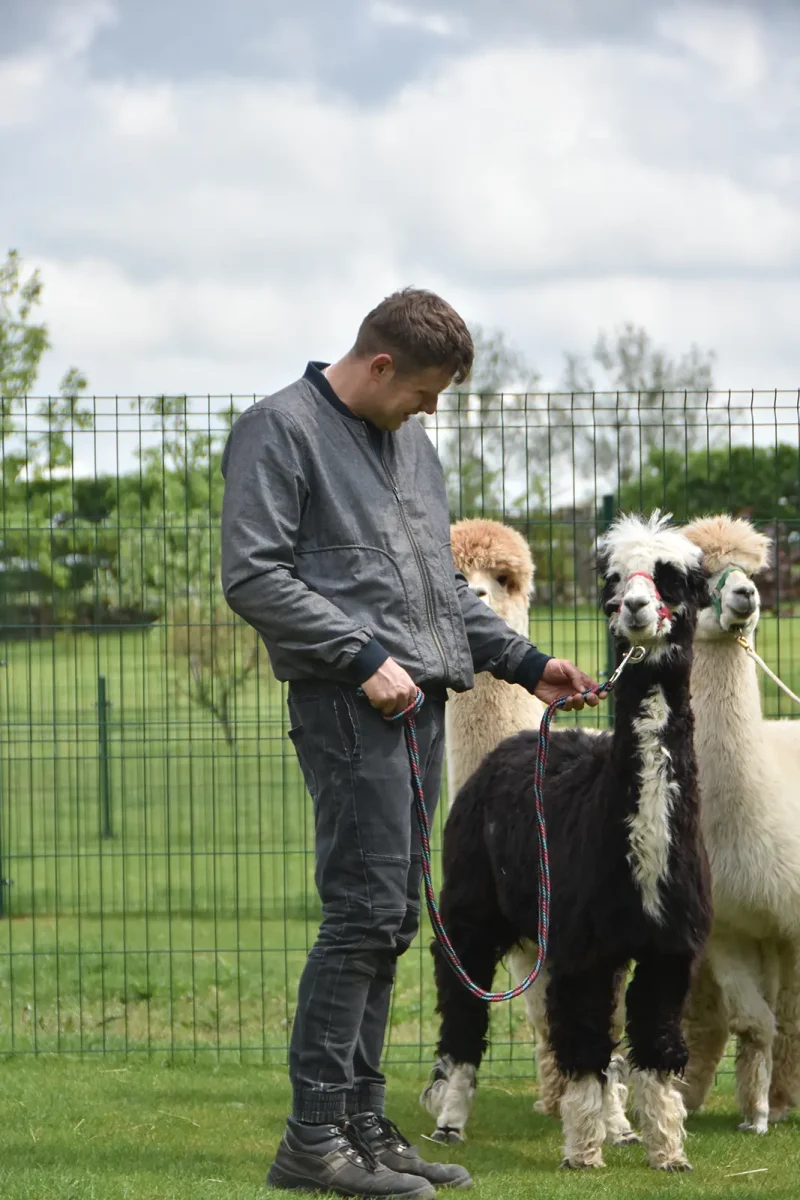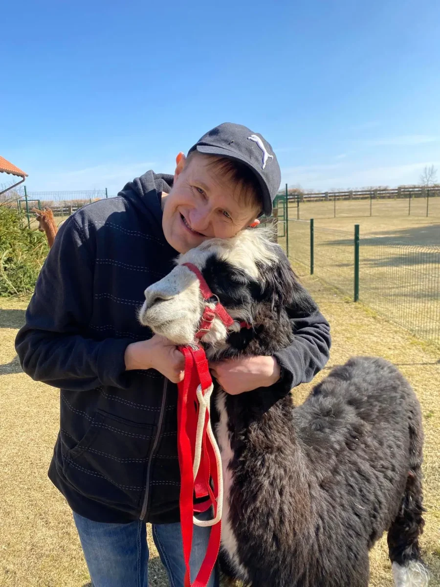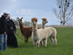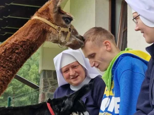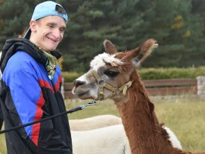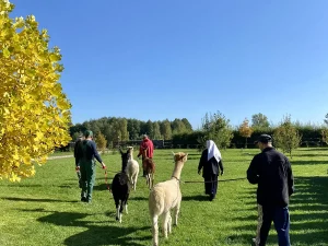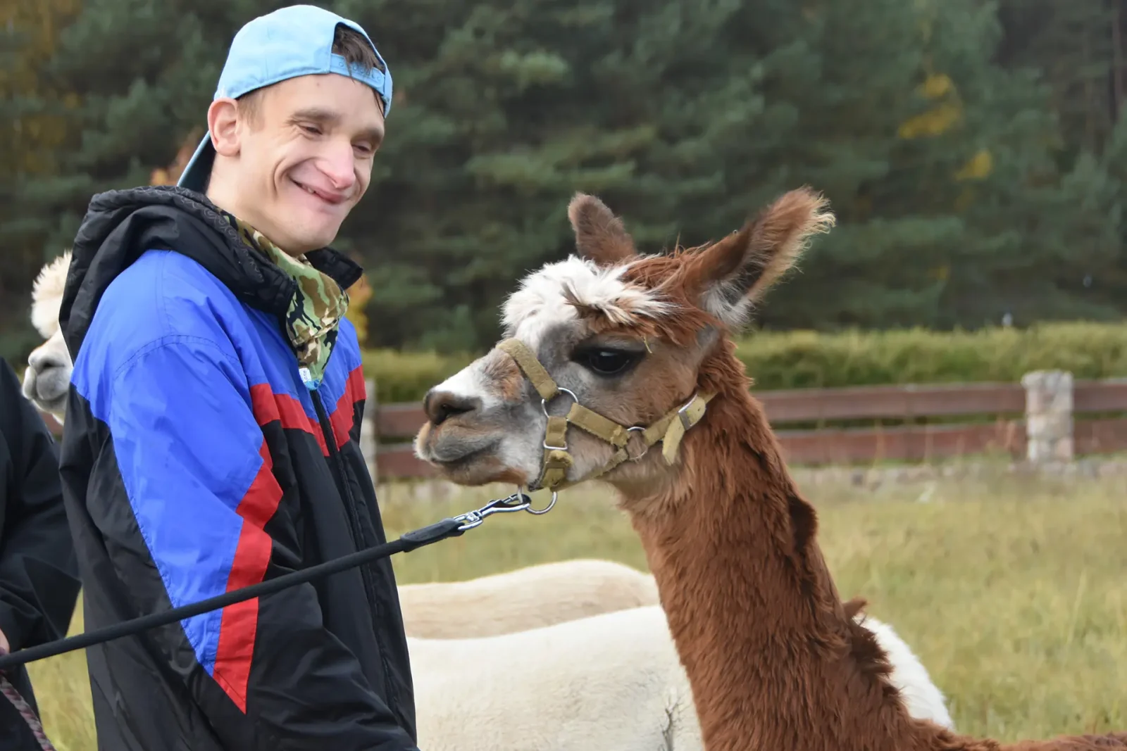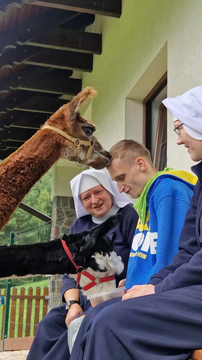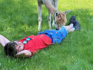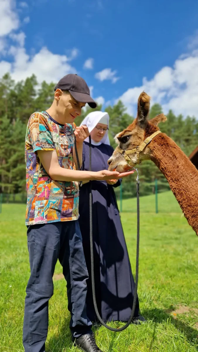Spacery z alpakami motywują do aktywności fizycznej, rozwijają koordynację wzrokowo-ruchową, spostrzegawczość i dają poczucie sukcesu.