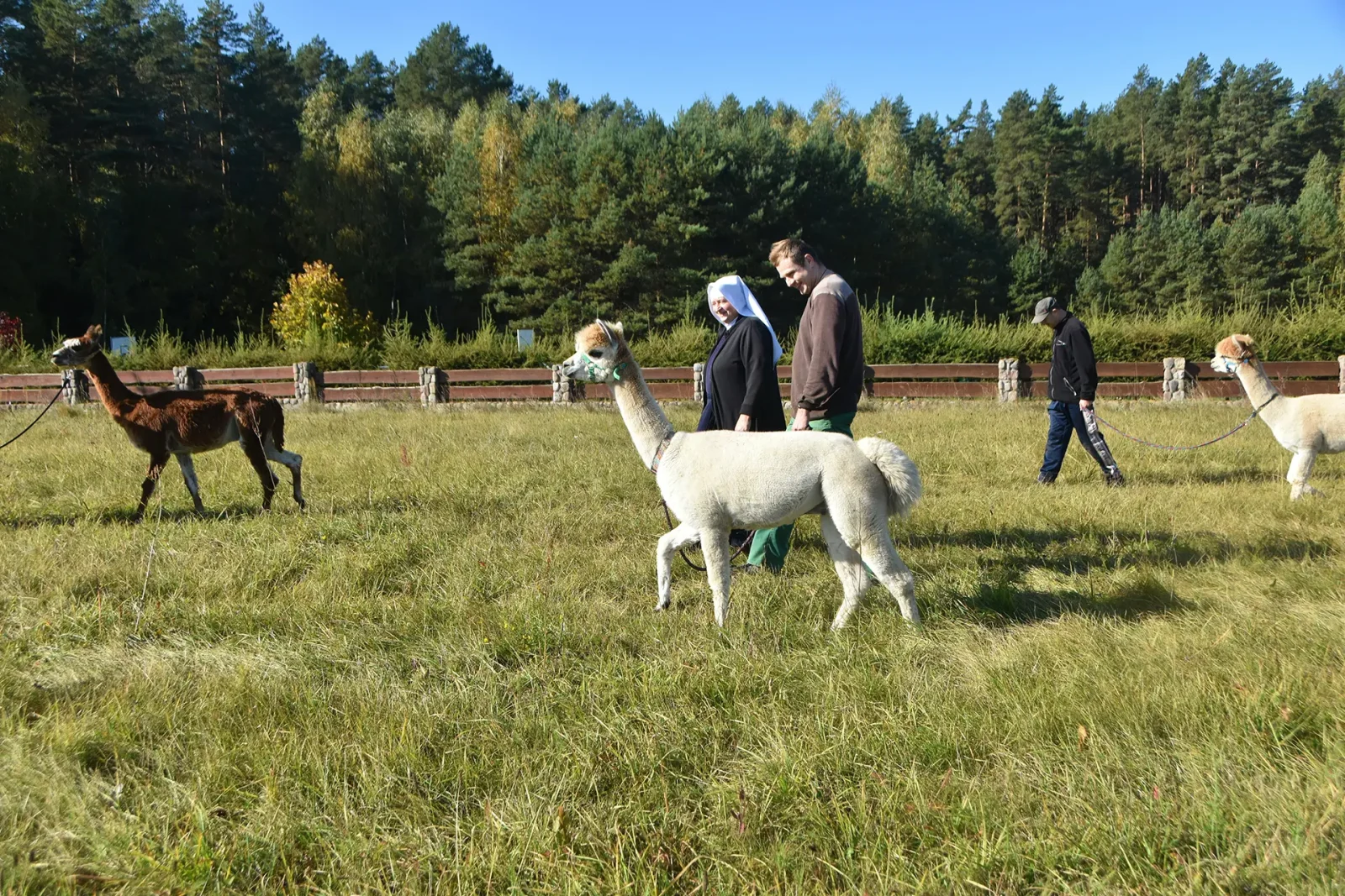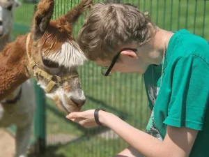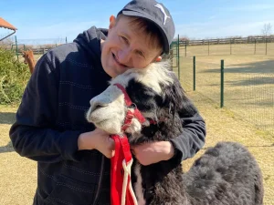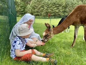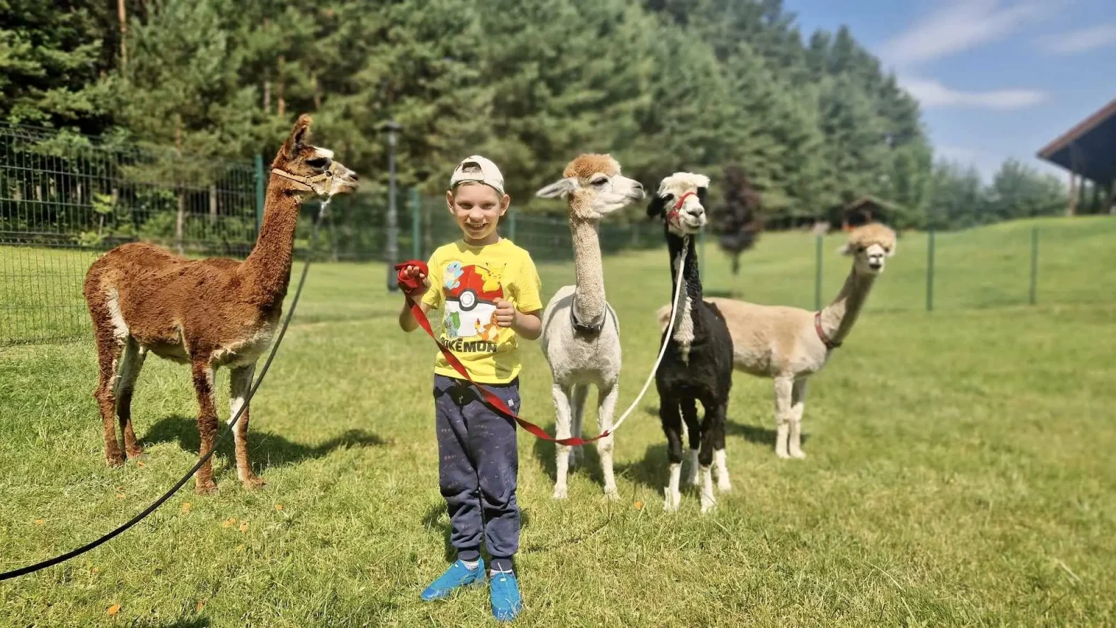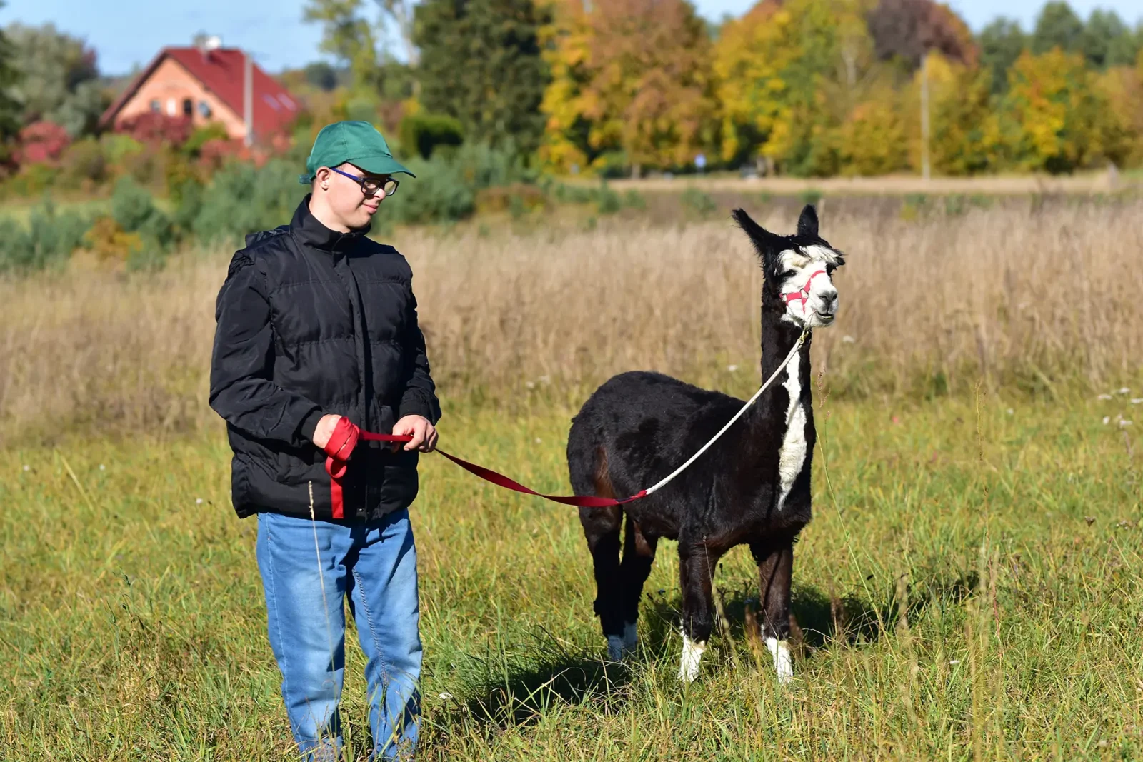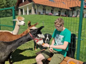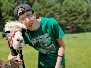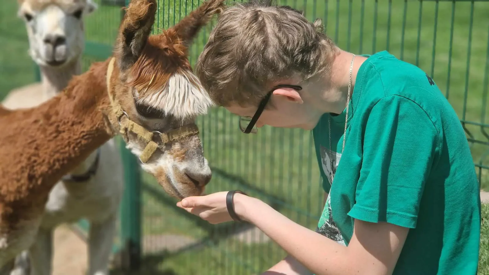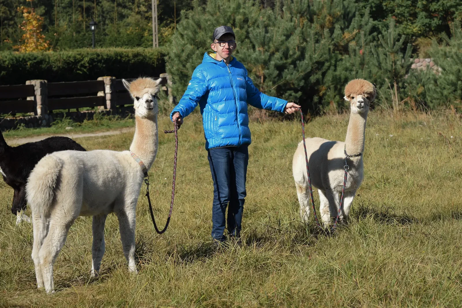 Spacery z alpakami motywują do aktywności fizycznej, rozwijają koordynację wzrokowo-ruchową, spostrzegawczość i dają poczucie sukcesu.