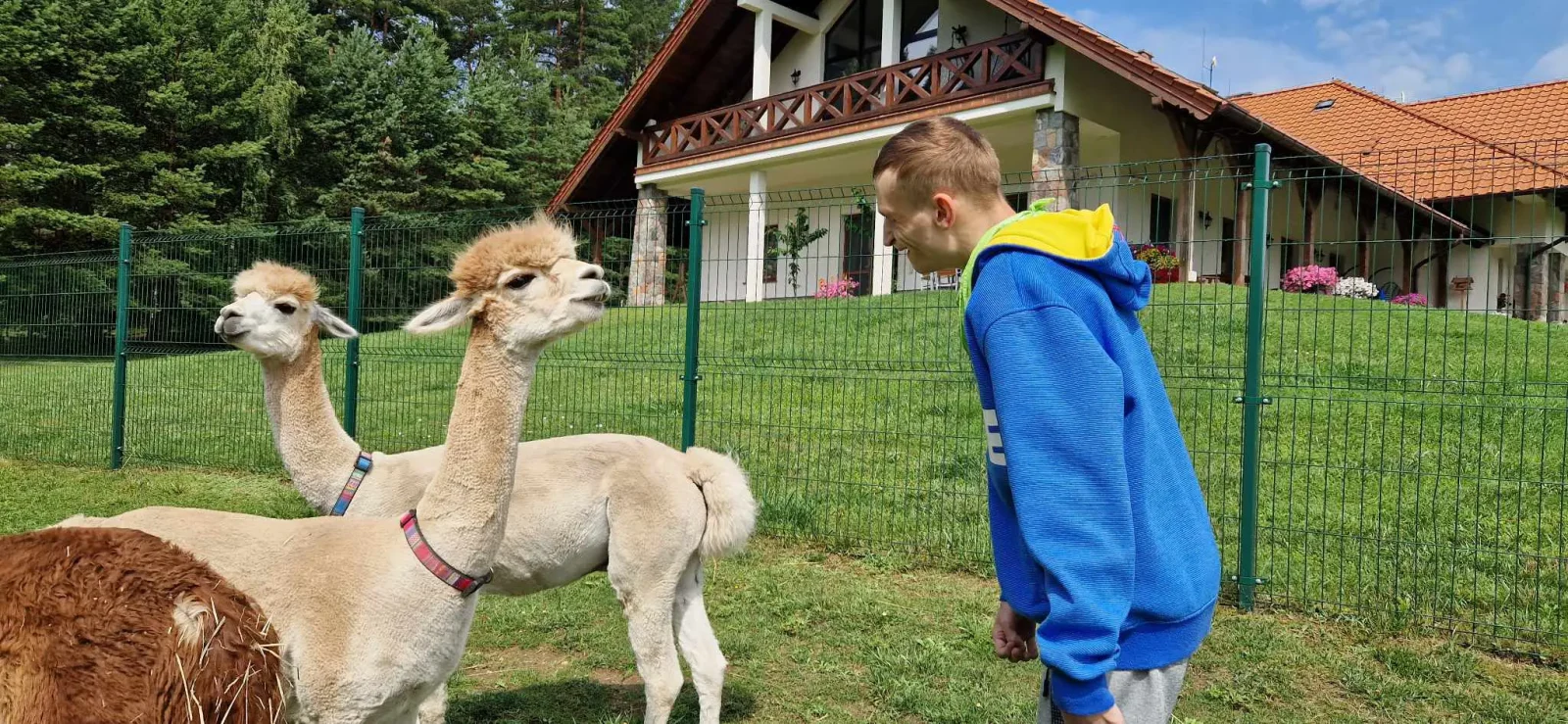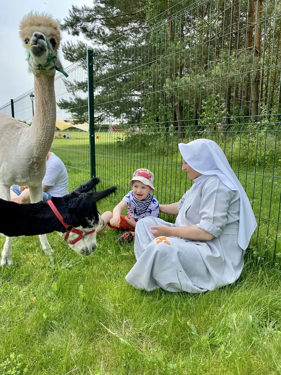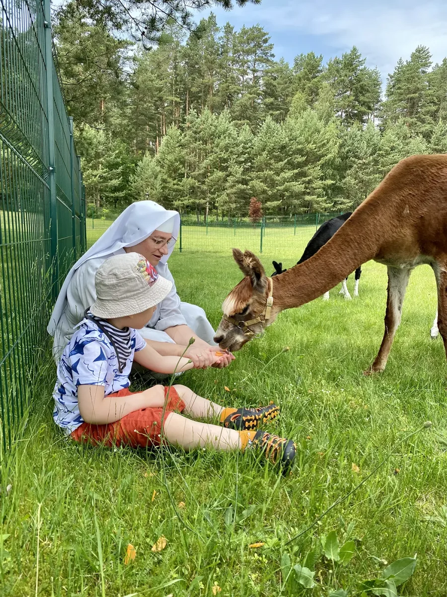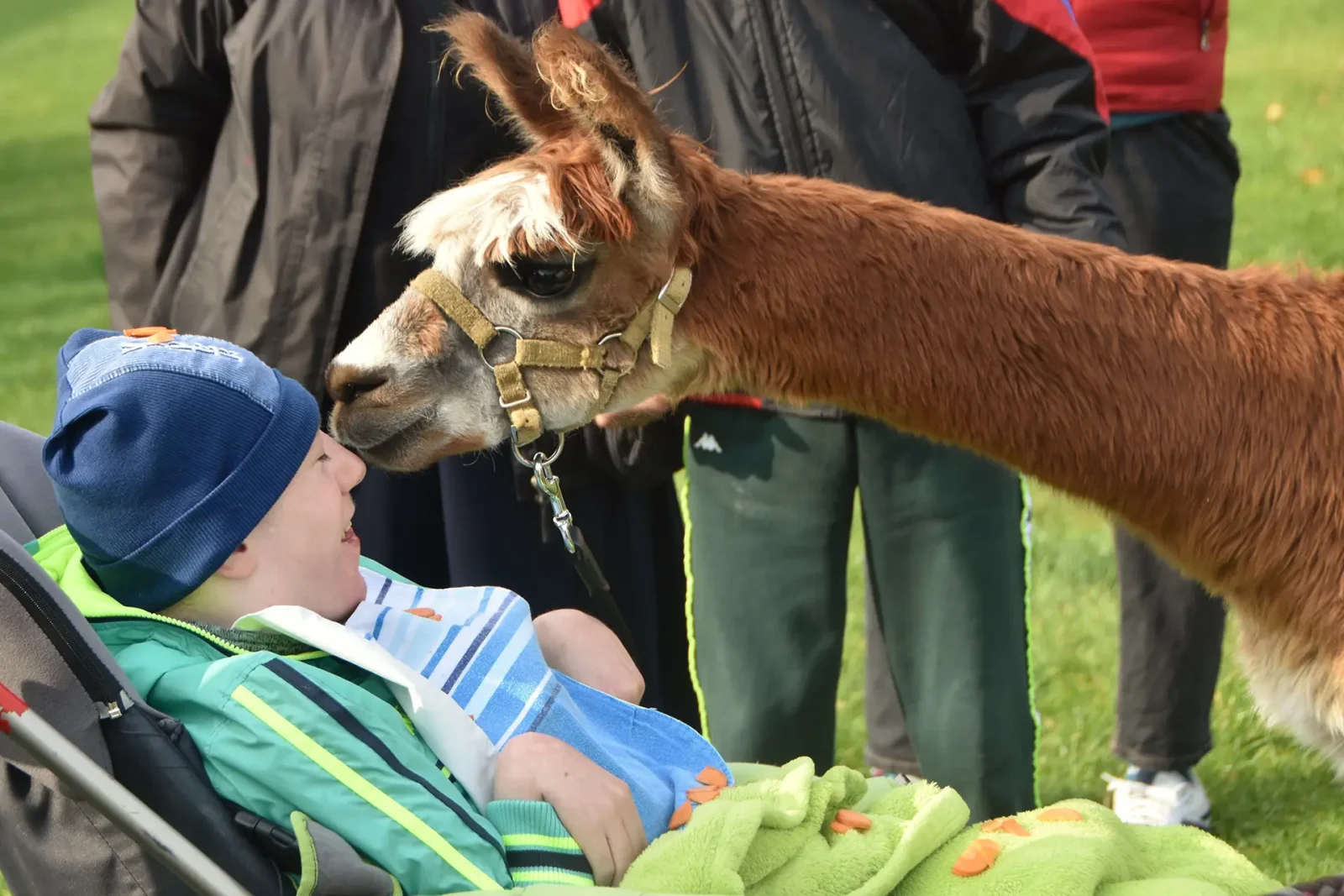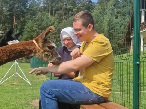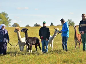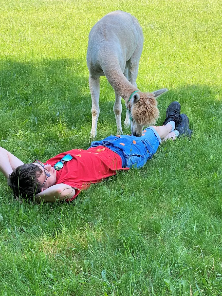 Spacery z alpakami motywują do aktywności fizycznej, rozwijają koordynację wzrokowo-ruchową, spostrzegawczość i dają poczucie sukcesu.